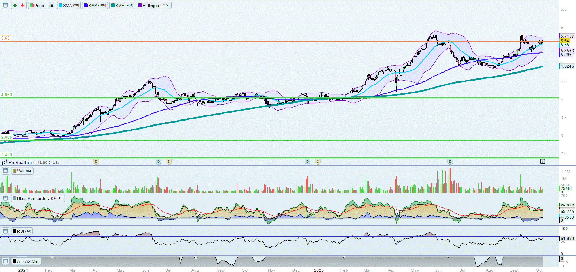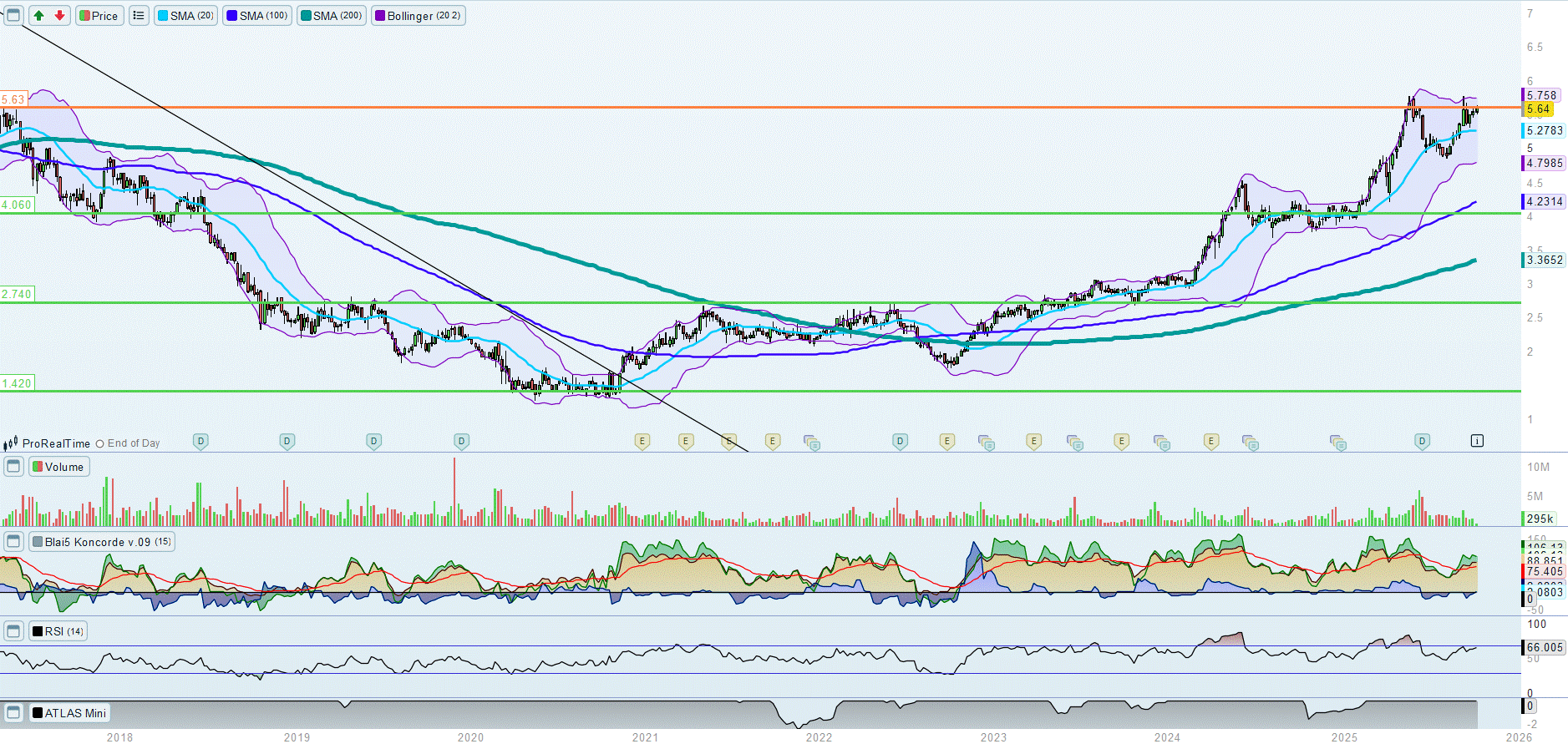 Actualmente el valor ha superado esos 4,06€, algo que está dando pie a atacar la siguiente resistencia en los 5,63€, cuya superación abriría un panorama alcista importante.