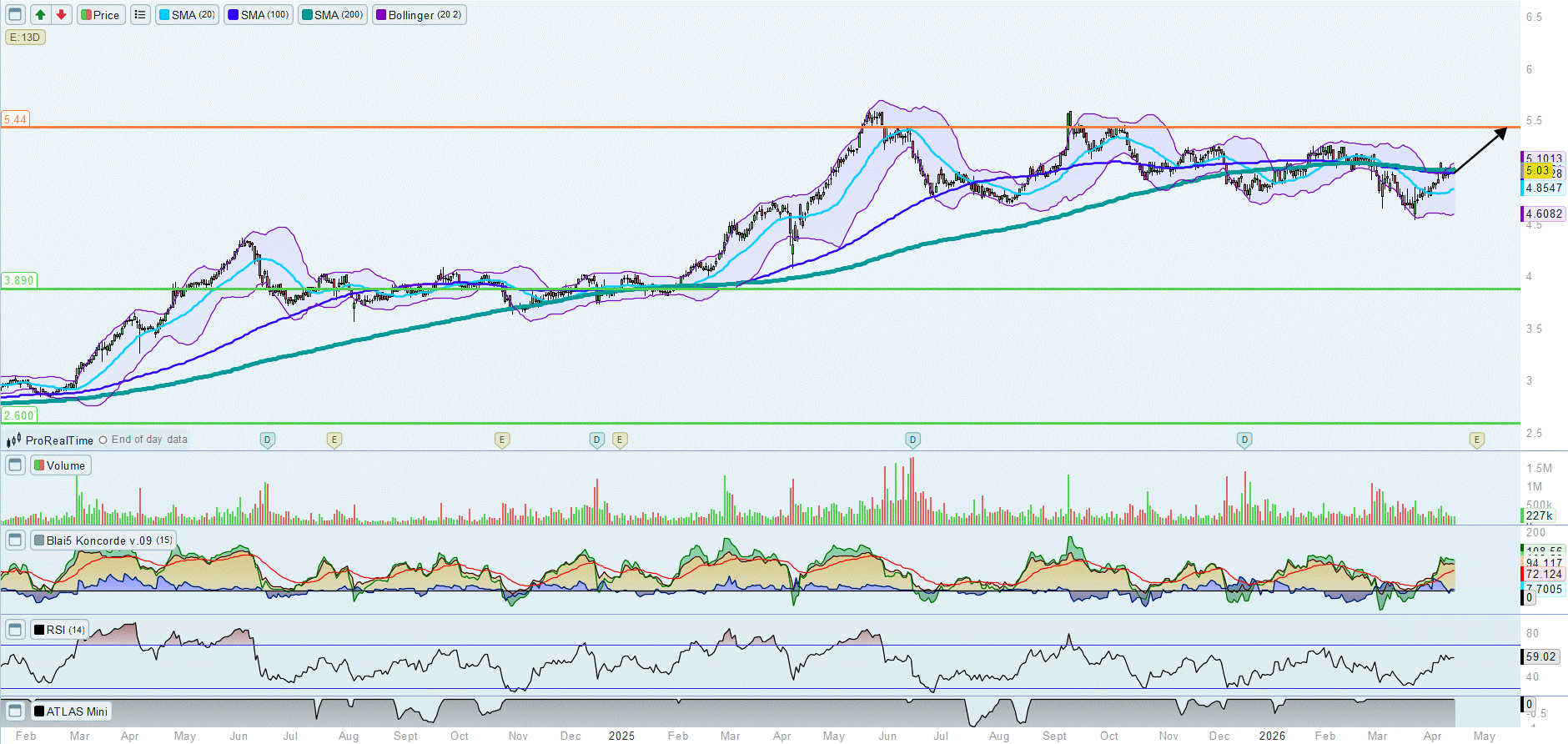 A favor de atacar y superar los 5,44€ tenemos unas manos fuertes compradoras y una media móvil de 20 girando al alza.