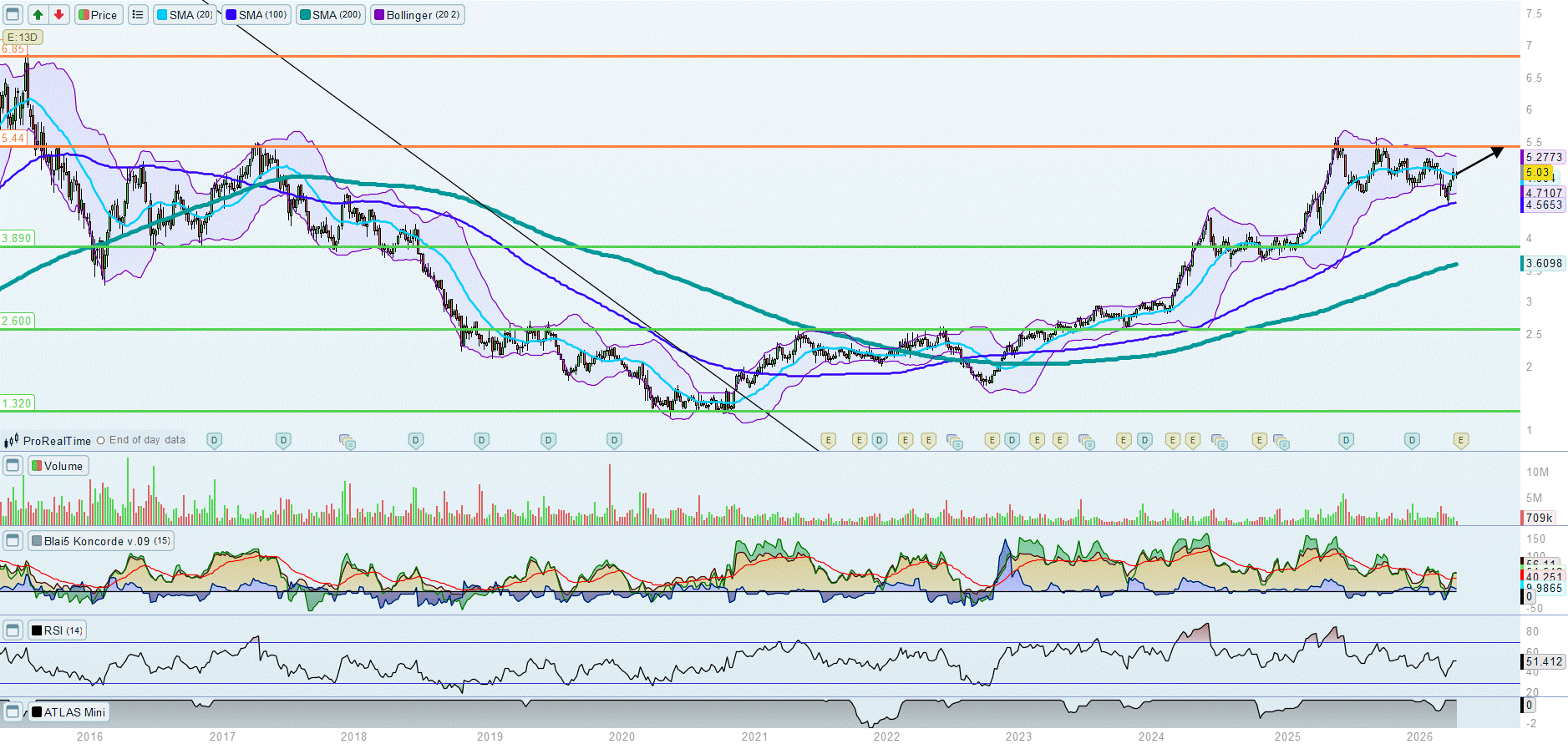 Actualmente el valor ha superado esos 3,89€, algo que está dando pie a atacar la siguiente resistencia en los 5,44€, cuya superación abriría un panorama alcista importante y abriría la puerta a buscar MÁXIMOS HISTÓRICOS en los 6,85€.