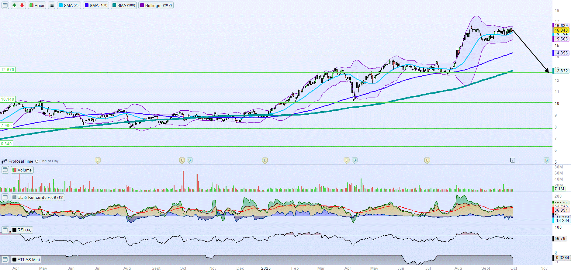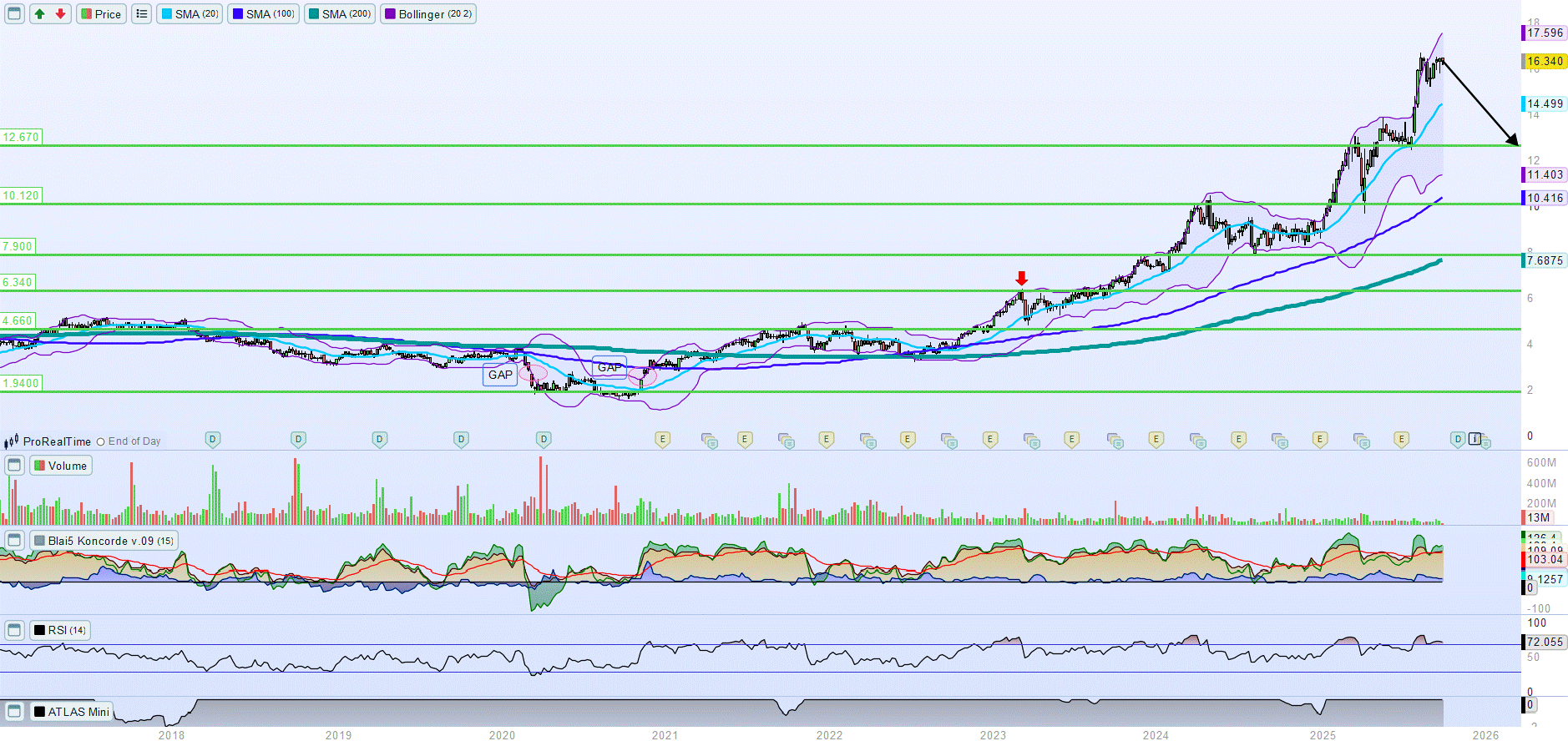 Actualmente, tras apoyar en los 7,90€, el precio ha reanudado la subida y ha superado los máximos recientes situados en los 10,12€, abriendo un nuevo camino alcista que ha servido para generar un máximo en los 12,67€, zona que también ha superado tras un primer rechace, dejando una situación de subida libre sin resistencias a la vista.
