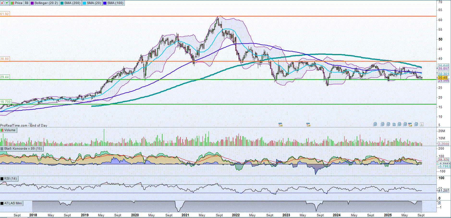 Importante mencionar que el Atlas funcionó (a la baja) cuando se activó pero ahora vuelve a estar desactivado, por lo que no esperamos grandes movimientos en las próximas fechas. El konkorde, por su parte, muestra unas manos fuertes dubitativas, con la media móvil de 20 por debajo la de 200, por lo que la recuperación de los 38,80€ no es tan clara y si se da esa subida seguramente conlleve correcciones por el camino.