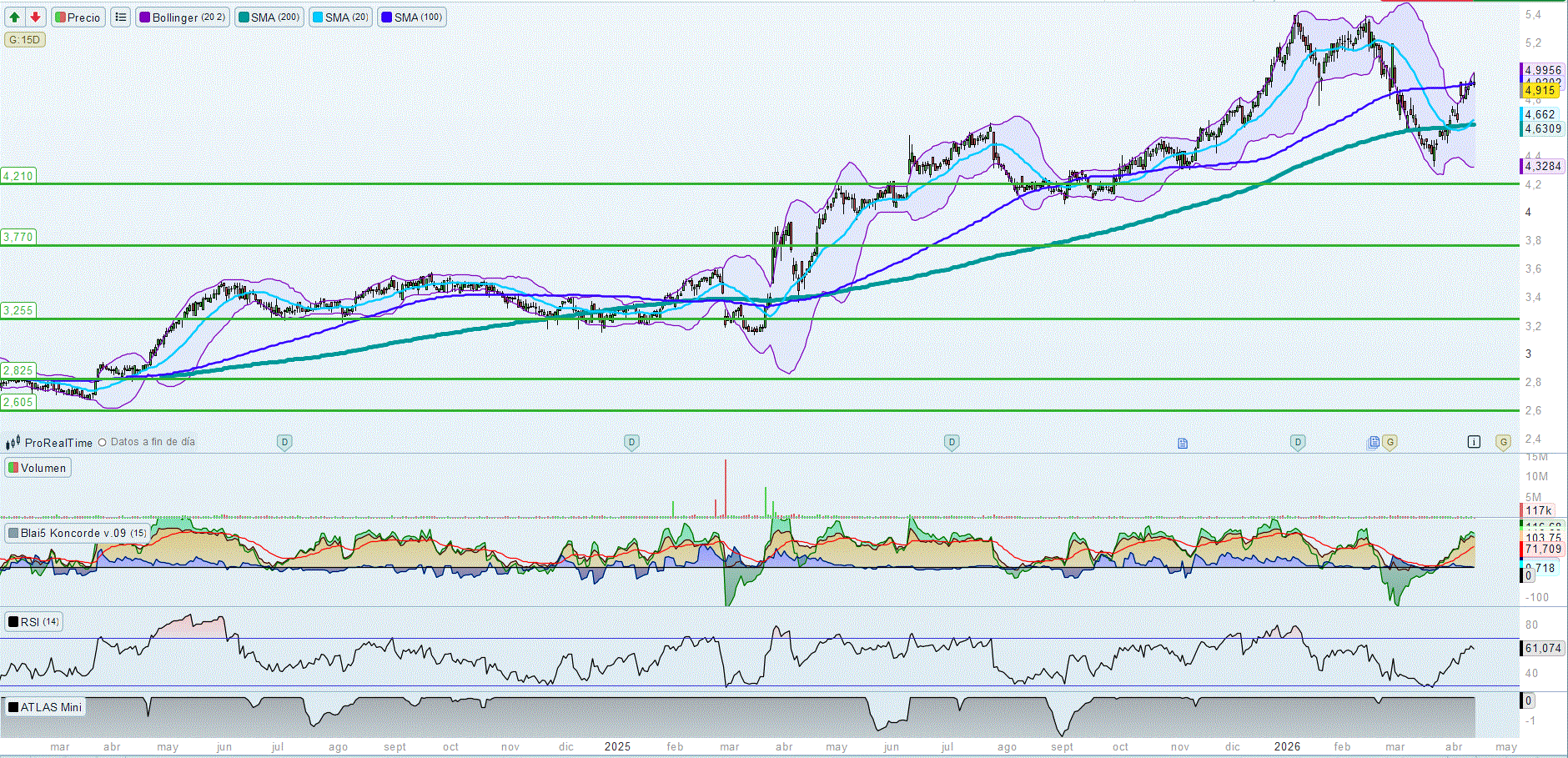 Por abajo, importante mantener referencias intermedias o el precio bajaría a buscar zonas de apoyo, pudiendo llegar también de nuevo al soporte situado en los 3,77€ en caso de tener una nueva corrección.
