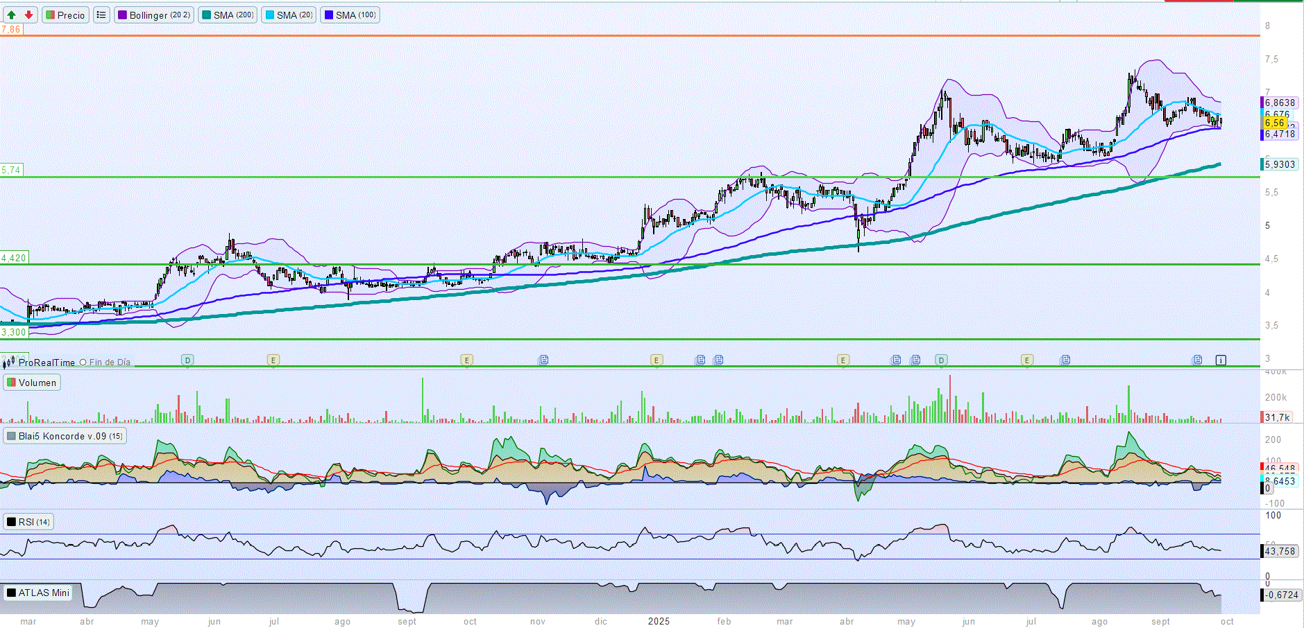 Dependiendo la situación macro, no descartamos que baje a ciertos soportes, siendo el de los 4,40€ el siguiente más cercano en caso de perder los 5,75€. Por debajo aunque los 4,20€, donde está la media móvil de 200 que puede funcionar.