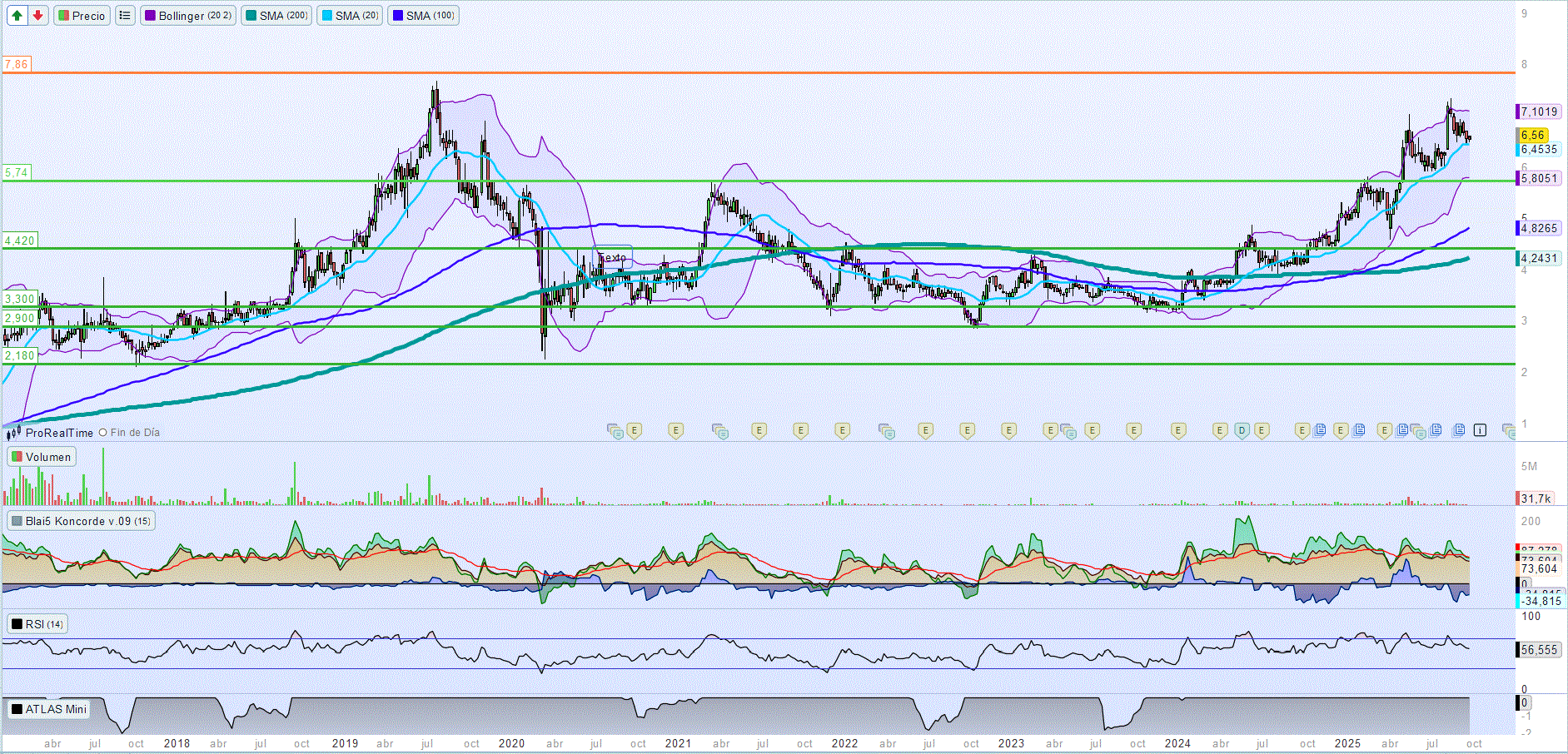 El precio en 2024 hizo una estabilización que le hizo consolidarse por encima de ese soporte y recientemente superó también los 4,40€, subiendo después de eso, y acercándose y atacando la siguiente resistencia (5,75€), que ha conseguido superar recientemente, en el segundo ataque, después del buen guidance que presentó la empresa para próximos años.