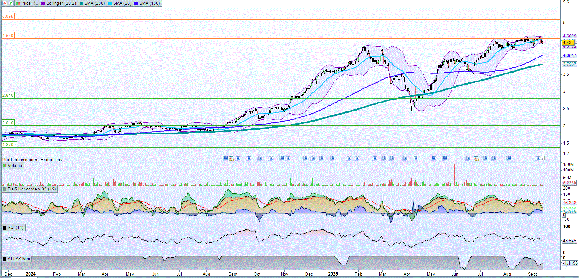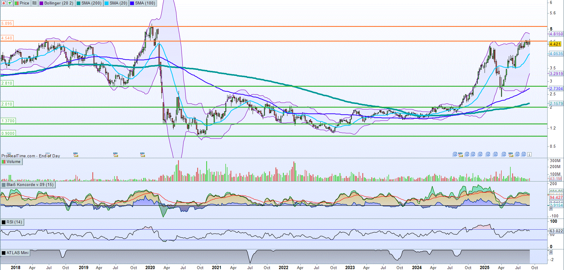 Hace no mucho, el precio hizo una corrección que le hizo volver a la zona de los [2,80-2,90]€, desde donde ha pegado otro buen rebote que ha hecho que el precio esté atacando la zona de los 4,55€. A favor de este ataque tenemos unas manos fuertes compradoras.
