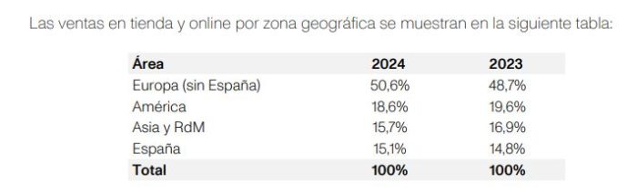Zara es la que engloba la mayor parte de las ventas, como puede observarse en la siguiente tabla, donde se muestran las ventas en 2024 de cada uno de los formatos de la marca: