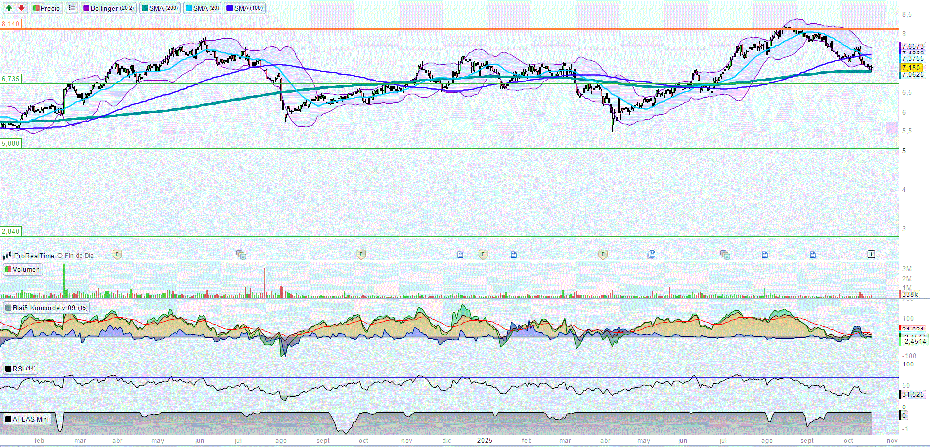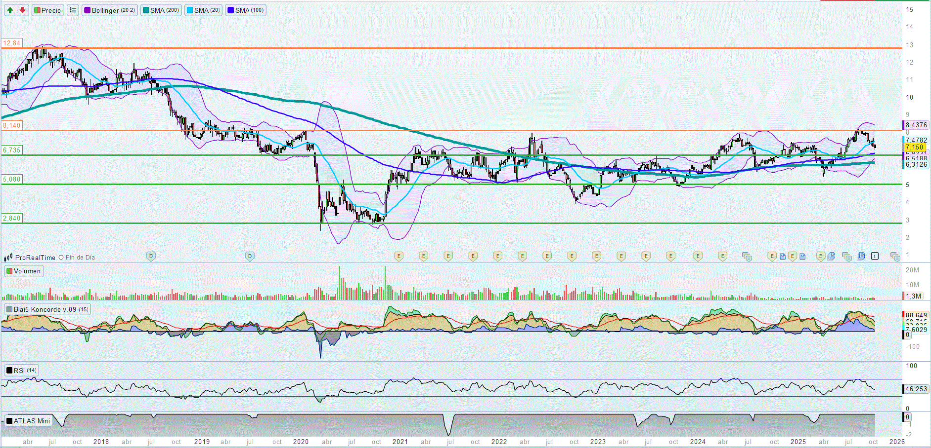 El precio volvió a perder el soporte de los 6,75€, con un suelo difícil de marcar más allá del soporte de los 5,10€, pero ahora mismo ha conseguido superar la referencia con claridad. De hecho, ha conseguido subir de forma rápida y hacer un primer ataque a los 8,15€, aunque no ha podido con la referencia.